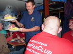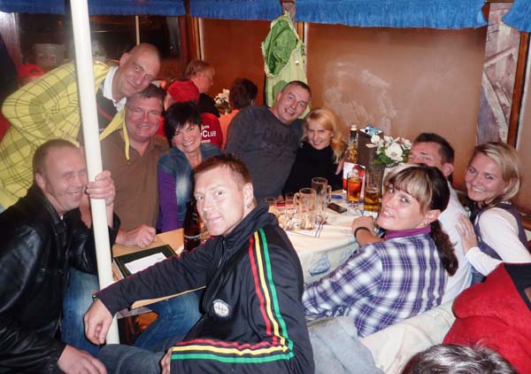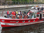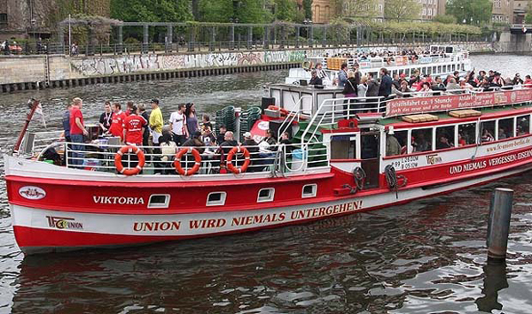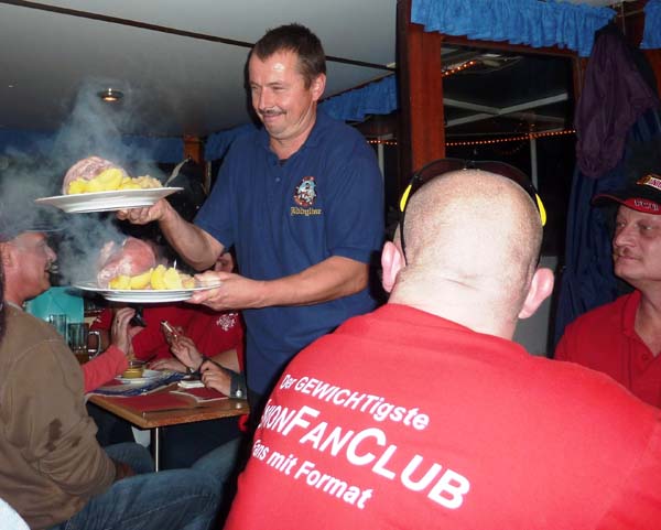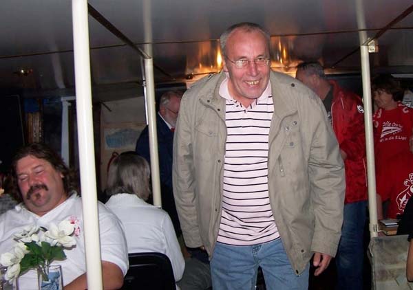Eisernes Eisbein-Essen Ende September folgten wir einer Einladung der InterESSENgemeinschaft „Eiserne Kubik-Elfen“ zum Eisbein-Essen. Vom Berliner Dom aus sind wir mit Eddy´s Dampferflotte in See gestochen. Neben den Kubik-Elfen und der Komakolonne Ost-Berlin war als Ehrengast Wolfgang „Potti“ Matthies an Bord. Potti hat in der Zeit von 1971 bis 1983 beim 1.FC Union zwischen den Pfosten gestanden und ist für uns zum Idol geworden. Nach 2-jährigem Gastspiel beim 1.FCM kam er 1985 wieder an die Alte Försterei zurück und war bis 1987 wieder die Nummer 1 im Union-Tor. Auf unserem Dampfer war super Stimmung und Leierkasten-Bernhard heizte uns mit Unionsongs ein. Dazu gab es deftiges Eisbein und lecker Bierchen vom Fass. Auch wir Zahnstocher (so werden bei den Kubik-Elfen liebevoll die Unionfans unter 100kg genannt) haben die Eisernen Rieseneisbeine restlos vertilgt. Danach waren zwar einige Absacker nötig, aber wir hatten uns den Spott der Kubik-Elfen erspart. Unsere Tour führte lautstark durch Charlottenburg, wo natürlich diverses Union-Liedgut die blauweißen Ufern erschüttern ließ (zur Erinnerung: das Berliner Derby 1.FC Union gegen Hertha BSE vor ein paar Wochen in der ausverkauften Alten Försterei endete 1:1 für unseren FCU), weiter durch Spandau bis zum Wannsee. Das dortige Feuerwerk „Wannsee in Flammen“ war nett anzusehen und wir unterstützten die Feuerwerker tatkräftig mit unseren Pyros. Und es gab nicht mal Stadionverbot dafür… Auf´m Rückweg hat Leierkasten-Börni die Hymne von unserer Nina auf seinem Kasten gedudelt und bei seinem Titanic-Lied konnten wir Käptn Eddy mit ruhigem Gewissen das blaue Band verleihen. Denn bei seiner rekordverdächtigen Rückfahrt glühte unsere Schiffsschraube sogar unter Wasser. Hey wir waren von allen Dampfern dritter in der Schleuse! Das bedeutet für Eddy: Qualifikationsrennen zur 1.Dampferbundesliga und für uns: Anmeldung für´s nächste Eiserne Eisbeinessen.