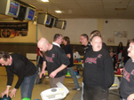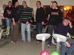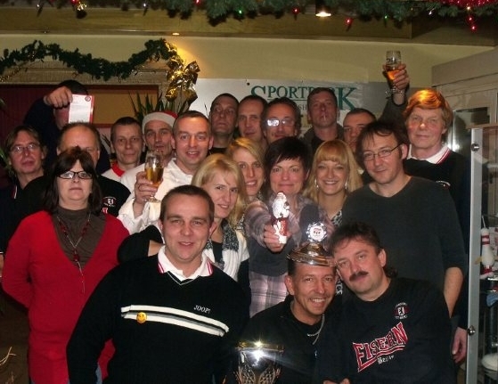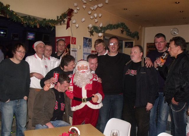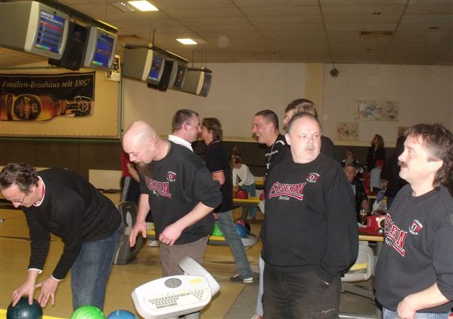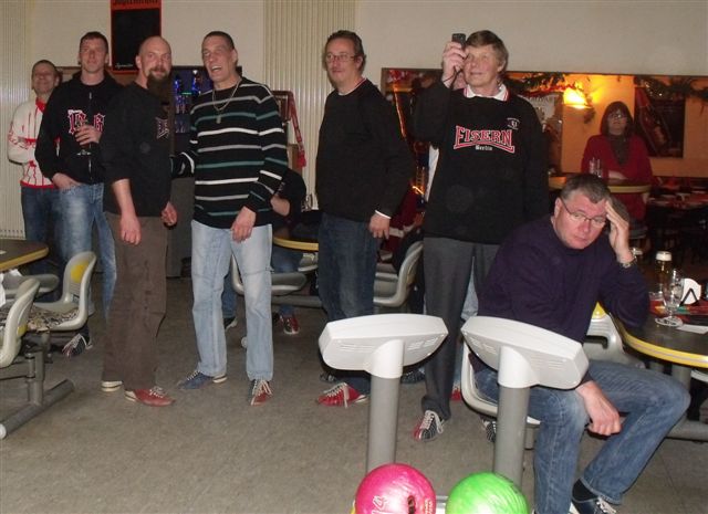 Weihnachtsfeier 2010 Auch 2010 haben wir das Jahr traditionell mit unserer Fanclub-Weihnachtsfeier ausklingen lassen. Im Sportpark Karlshorst hatten wir 5 Bowlingbahnen reserviert, auf denen 3 Stunden lang die Kugeln rollten. Bowling ist eine Art Sport, der in der Regel am kommenden Tag zu üblen Muskelkater führt. Ziel des Spieles ist es, mit einer der enorm großen und schweren Kugeln, die man nicht Kugeln sondern Bälle nennt, auf die am Ende der Bahn stehenden 10 Kegel, die man nicht Kegel sondern Pins nennt, zu werfen, um sie möglichst alle umzuschmeißen. Doch erstmal haben wir uns auf dieses große Sportereignis auf bewährte Weise durch Bierkonsum vorbereitet. Denn Bier hilft immer. Danach ging es 3 Stunden in die Vollen. Der Sieger des Koma-Bowling 2010 war Kaiser „Wulfi“ der – wie von der unbestechlichen elektronischen Anzeige angezeigt – in einem Durchgang 171 Pins erlegte und sich damit verdient unseren Fanclub-Wanderpokal einheimste. Hier die 5 besten Bowler dieses Abends, die wie jedes Jahr dadurch automatisch für das Fanclubbowling des Eisernen VIRUS im kommenden Jahr qualifiziert sind und unsere Komakolonne dort vertreten werden: 1.Platz : 171 Pkt. Wulfi2.Platz : 153 Pkt. Rinne 3.Platz : 142 Pkt. Maiki 4.Platz : 140 Pkt. Holly 5.Platz : 138 Pkt. Hightowa