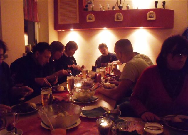 Nach dem Bowlingturnier haben wir uns noch alle gemütlich an einer Weihnachtstafel zusammengesetzt. Endlich wurde Essen serviert, denn vielen knurrte schon der Magen. Man konnte wählen zwischen Entenbraten oder Gänsekeule. Dazu gab es Rotkohl, Grünkohl, Klöße oder Kartoffeln und gaaanz viel Soße. So richtig weihnachtlich. Dank der flinken Kellnerin klingelten nicht nur die Glöckchen sondern auch die Gläser. Ein schöner Abschluss eines ereignisreichen Jahres.