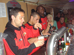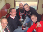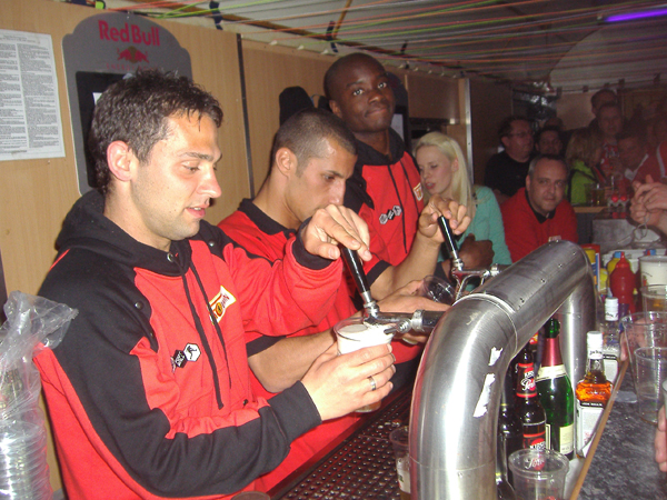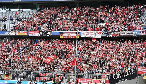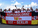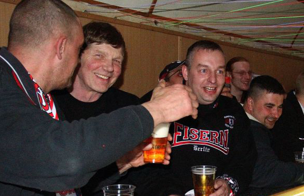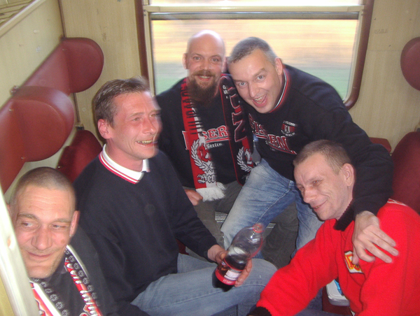 Im Partyzug auf den Betze Unions erste Saison nach dem Wiederaufstieg in die 2.Bundesliga geht in die Zielgerade. Mit der Aufstiegseuphorie ist die Mannschaft des 1.FC Union spektakulär gestartet und stand bis zum 12.Spieltag immer unter den 4 besten Teams der 2.Liga. Dieser Traumstart weckte natürlich Erwartungen, das Saisonziel hieß jedoch immer Klassenerhalt. Nachdem die letzten Spiele nicht mehr so erfolgreich verlaufen sind, findet sich unsere Mannschaft nun auf einem gesicherten Mittelfeldplatz wieder und das Ziel Klassenerhalt erscheint mittlerweile realistisch und erreichbar. Neben den Heimspielen in unserer sanierten „Neuen Alten Försterei“ hatten wir in dieser Saison viele schöne Auswärtsfahrten. Augsburg mit Fantreffen, Aachen im neuen Tivoli, St.Pauli incl. Reeperbahn, Bielefeld im Berliner Pilsner-Bierbus, Rostocker Ostseestadion um nur einige zu nennen. Ein echtes Highlight unsere diesjährigen Auswärtsfahrten war jedoch die Fahrt mit einem von Unionfans gecharterten Partyzug nach Kaiserslautern. Los ging es früh um 3:00 Uhr ab Berlin-Lichtenberg. Im Zug erwarteten uns neben den normalen Abteilwagen auch zwei Partywaggons mit Biertresen, Biertischen, Tanzfläche, DJ und Musikanlage. Und das ganze ohne einen einzigen Bullen an Bord. Also beste Voraussetzungen für eine „non stop Unionparty“. Nach 7 feuchtfröhlichen Stunden in Kaiserslautern angekommen ging es erstmal in die Innenstadt… naja oder wie man die drei Straßen und die kleine Fußgängerzone auch nennen mag. Aber eines muss man den Pfälzern lassen: sie sind sehr gastfreundlich. Wir haben vor und nach dem Spiel viele nette Lautern-Fans kennen gelernt. Nun wurde schnell noch ´ne Bersteigerausrüstung besorgt und dann ging es hoch auf den Betzenberg. Schon ein toller Anblick dieses anmutig über der Stadt schwebende Stadion. Das Fritz-Walter-Stadion zählt für uns jedenfalls zu den schönsten Stadien Deutschlands und war mit 41.000 Zuschauern fast ausverkauft. Auch unser Gästeblock war mit über 2000 mitgereisten Unionfans gut gefüllt und die Berliner haben 90 Minuten guten Dauersupport hingelegt. Selbst FCK-Fans sagten nach dem Spiel, dass wir der beste Auswärtsmob in dieser Saison waren. Das Spiel bei den Roten Teufeln endete 1:1 und am Ende schwenkte unser komplette Unionblock und nicht wie gewohnt die FCK-Fans weiße Taschentücher zum Abschied. Nach dem Spiel wurde in einer Lautern-Kneipe noch entspannt ein Karlsberg geschlürft, bevor es dann ganz gemütlich zum Bahnhof ging. Vor uns lagen ja noch 650 km Heimweg, das heißt in unserem Fall 650 km Party. Als Krönung fuhr die komplette Mannschaft des 1.FC Union samt Trainerstab bei uns mit im Sonderzug zurück nach Berlin. Es dauerte nicht lange und die Spieler mischten sich unter das Partyvolk. Unsere Stürmer John, Karim und Shergo versuchten sich hinter dem Tresen und schenkten drei von der Mannschaft spendierte Fässer Freibier aus. Unser Torwart Jan stellte fest, dass so ein Fanzug viel besser ist als Flugzeuge und auch mit Stuffi, Tusche und Göhli konnte man entspannt quatschen. Insgesamt schlürften die Fans 16 Fässer Bier leer. Der DJ legte dazu gute Partymucke auf und so vergingen die 7 Stunden Rückfahrt wie im Fluge. Bierselig trudelte der Sonderzug um 0:30 Uhr in Berlin-Lichtenberg ein und alle waren sich einig: Danke Eiserner VIRUS! Bitte in der nächste Saison wieder so ein Partyzug… |