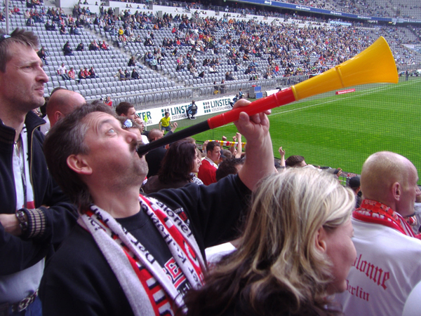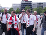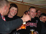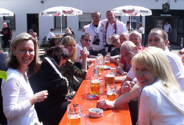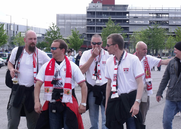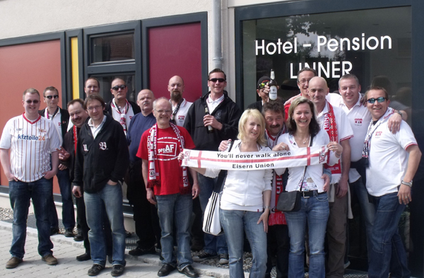 Saisonabschlussfahrt nach München Das letzte Spiel der Saison 2009/10 stand auf dem Terminkalender. Von langer Hand geplant ging es für 2 Tage auf Saisonabschlussfahrt nach München. Die Komakolonne war mit 24 Mann am Start und unsere drei 9-Sitzer setzten sich früh um 7:00 Uhr Richtung Bayern in Bewegung. Mit gefühlten 50 Zwischenstopps kamen wir Mittags gut gelaunt in Erding an. Wir hatten Zimmer im „Hotel Linner“ reserviert und mit diesem Hotel eine sehr gute Wahl getroffen. Etliche bekannte Gesichter kamen uns im Foyer entgegen und schnell konnten wir feststellen, dass dieses Hotel an diesem Wochenende fest in Hand der Unionfans war. Alle aus Berlin weggezogenen Unionfans (Exiler) treffen sich jährlich auf einem so genannten Exiler-Treffen, welches dieses Jahr in München/Erding stattfand. Unser ehemaliger Mannschaftskapitän Sebastian Bönig hat dort das „Erdinger Ballhaus“ eröffnet und stellte seine Räumlichkeiten für dieses Fantreffen zur Verfügung. Sämtliche Bundesländer waren vertreten und mit den angereisten Berlinern wurden die Anwesenden auf insgesamt 800 geschätzt. Das Bier wurde knapp, wir hatten es wieder einmal geschafft, eine Kneipe leer zu trinken – und das auch noch in Bayern. Aber die Erdinger Brauerei war in unmittelbarer Nachbarschaft und so wurde schnell für Nachschub gesorgt. Es gab eine Talkrunde mit Union-Manager Christian Beeck und Mannschaftsbetreuer Detlef Schneeweiß. Und dann kam er, der Song-Contest, Bestandteil jedes Exilertreffens. Zwar werden da fast sämtliche Unionlieder gesungen, aber es gab ja eine Abstimmung im Unionforum und die musste jetzt auch runtergesungen werden. Man war das laut… Der Sieger unseres fanclubinternen Komakolonnen-Song-Contest war übrigens unser Guido (GaP) mit seinem Hit: „Ich bin euer Bauer ihr Hauptstadt“. Die Party war einfach nur genial. Union ist eben nicht nur der Fußball, da ist noch viel, viel mehr dahinter. Auf Grund der Sperrstunde in Bayern blieb uns leider nichts anderes übrig, als gegen Mitternacht gesangesfreudig Richtung Hotel aufzubrechen. Einige unserer Junggesellen hatten jedoch noch nicht genug und stürzten sich ins Erdinger Nachtleben (ja dieses Nest hat eine Disko). Nachts unsere orientierungslos rumirrenden Wulf´is mit dem Handy einfangen, hat auch was. Und danach beim Bierchen eine Grundsatzdiskussion führen und zur grauenvollen Erkenntnis kommen, dass man bei den Frauen die Altersmesslatte jetzt doch langsam höher anlegen sollte. Am nächsten Morgen trafen sich alle ziemlich zeitig im Hotel-Restaurant zum Frühstück wieder. Man wollte wohl den Frühschoppen in der Sonne genießen. Und so kam es, dass die ganze Komakolonne so gegen 10:00 Uhr wieder im Ballhaus Erding saß. Die Bierfässer waren voll, bayerisches Frühstück wurde angeboten und man wartete gespannt auf die Talkrunde mit dem Union-Präsi Dirk Zingler. Er stand den Fans Rede und Antwort. Bei kalten Getränken und schönstem Sonnenschein im Biergarten wollten wir am liebsten die Zeit anhalten. Aber es wurde Zeit, langsam die Zelte in Erding abzubrechen. Schließlich stand ja noch ein Fußballspiel auf der Tagesordnung. Gemeinsam mit dem UFC Sachsenadler fuhren wir im Konvoi nach München-Fröttmanig. Aus taktischen Gründen wurde noch die letzten Kneipe vorm Stadion aufgesucht (danach begann nämlich die bargeldlose Premium-Arena-Card-Zone). Darum wurden hier nochmal ein zwei Bierchen geschlürft und sich mit bzw. gegen 1860-Fans warm gesungen. Danach ging es Richtung Stadion und man hörte sämtlichste Synonyme für die Allianz-Arena: Gummiboot, gelandetes Ufo, Blubberblase, weißer Zeppelin… Alle lästerten: „Dit is doch keen Stadion“ aber komischerweise wollte fast jeder davon ein Foto machen. Wir natürlich auch. Mal kurz zum Spiel: das letzte Spiel der Saison, es ging eigentlich um nichts mehr. Das war vielleicht auch der Grund, warum unsere Spieler Mattuschka und Dogan beim Spielstand von 0:1 und einem zugesprochenen Elfmeter im Strafraum knobelten, wer von beiden den Elfer einschießt. Oder besser gesagt verschießt, denn letztendlich hat der FCU gegen 1860 München mit 0:2 verloren. Im Stadion waren 26.000 Zuschauer und der rot-weiße Unionblock in der Arena war schon beeindruckend. Die gut 3500 mitgereisten Unioner waren in dieser Saison unser Away-Rekord und machten einen fast durchgängigen Support. Man bekam schon Gänsepelle vom Union-Hymnen-Wechselgesang zwischen Unterrang und Oberrang. Laut Aussagen der Batzis haben wir in München einen sehr guten Eindruck hinterlassen. Insbesondere auch die Unionfans, welche sich vor dem Spiel in der Innenstadt aufhielten. Die Rückfahrt verlief relativ unspektakulär und unsere drei 9-Sitzer trudelten dank eines gut funktionierenden Inkontinenz-Management gegen Mitternacht wieder in Berlin ein. Insgesamt muss man feststellen, dass dieses Erdinger Exilertreffen 2010 das Sahnehäubchen eines sehr kurzweiligen zweitägigen Ausfluges nach Bayern war. Vielen Dank an Böni, olle Oma, Rolle und allen anderen Organisatoren. Nun können wir uns ganz entspannt zurücklehnen, die Fußball-WM 2010 in Südafrika genießen und uns auf die kommende Saison in der 2. Bundesliga freuen.
